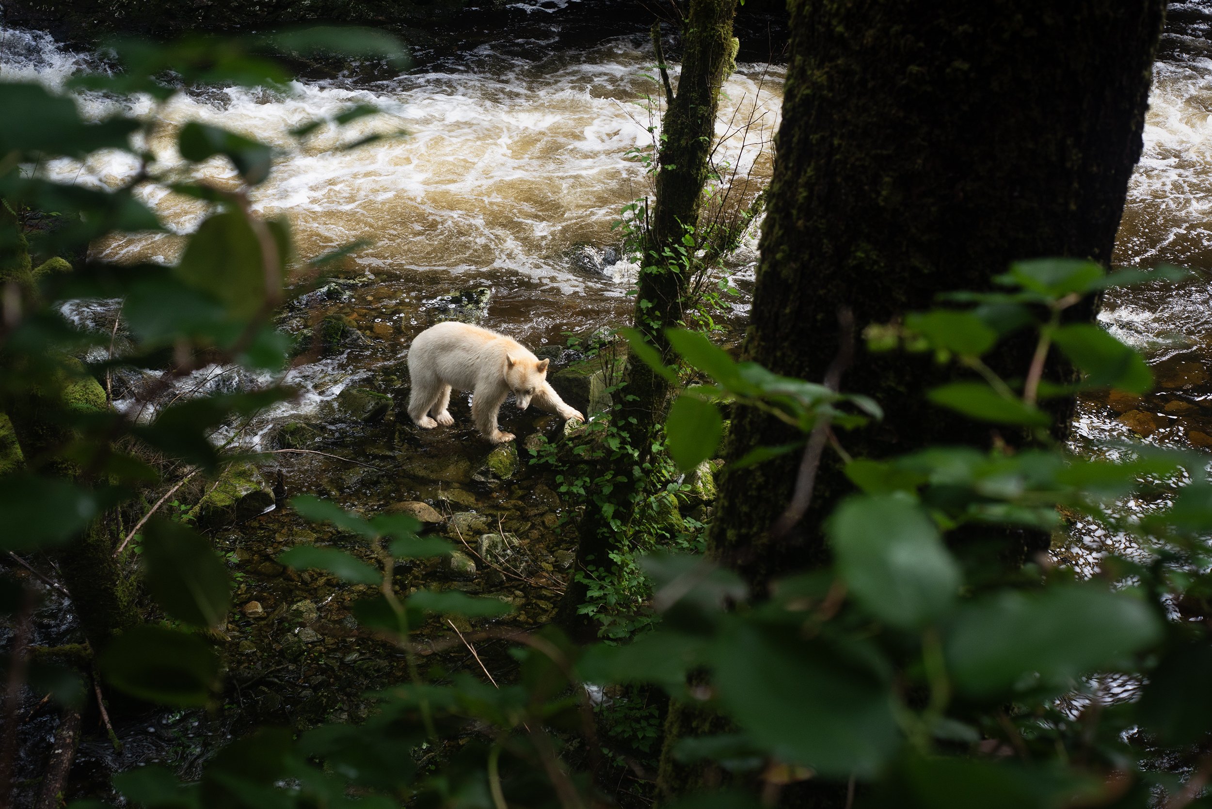 A spirit bear moves carefully through a shallow rainforest stream, its pale coat catching what little light filters through the canopy. The bear is not centered, nor dominant in the frame. It is partially obscured by leaves and tree trunks, surrounded by moving water, moss-covered stones, and dense forest growth. The photograph is not about the bear alone, but about the fragile conditions that allow it to exist at all: intact watersheds, healthy salmon runs, and old-growth forests that regulate temperature and flow. Remove the environment, and the image becomes symbolic. Include it, and the photograph becomes specific, rooted in place, and therefore rooted in responsibility.